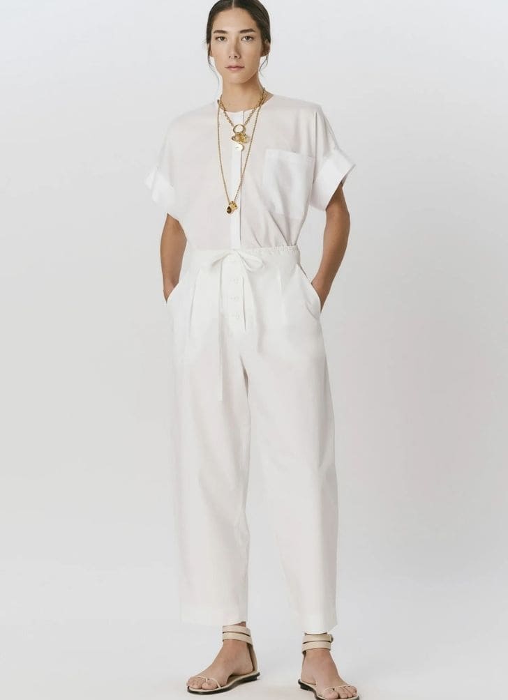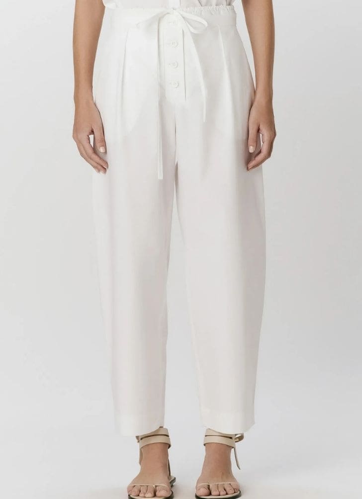 Calça em algodão empapelado na cor Branca. A peça possui modelagem baggy*, com cintura alta e pregas rasas. O modelo possui cós duplo*, bolsos faca nas laterais e bolsos traseiros chapado. Fechamento frontal por botões. O tecido utilizado não possui elasticidade