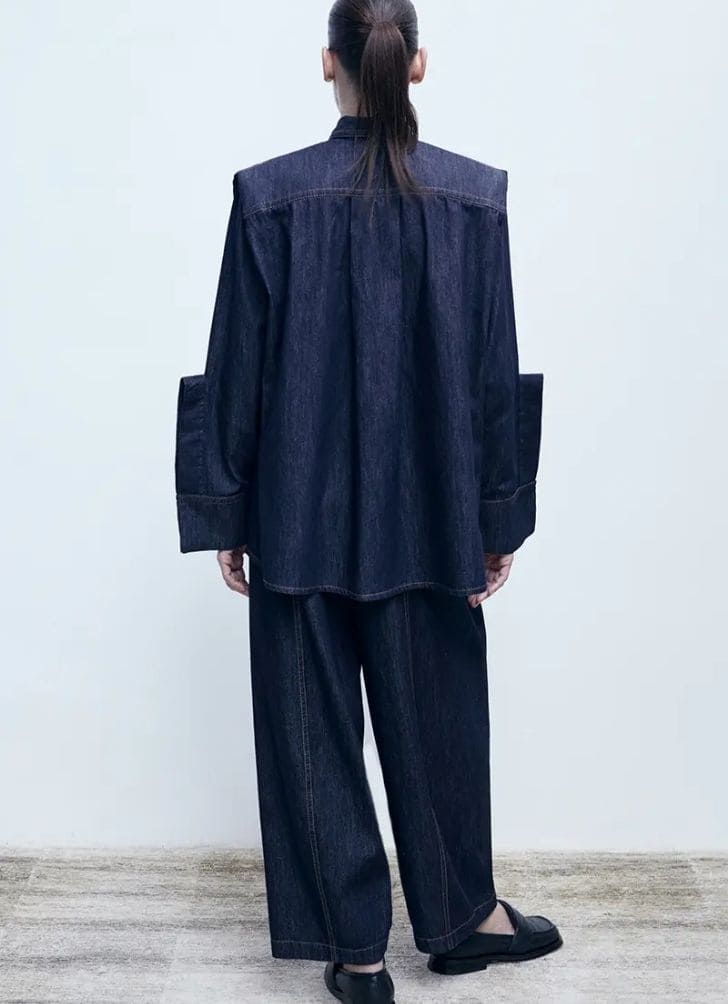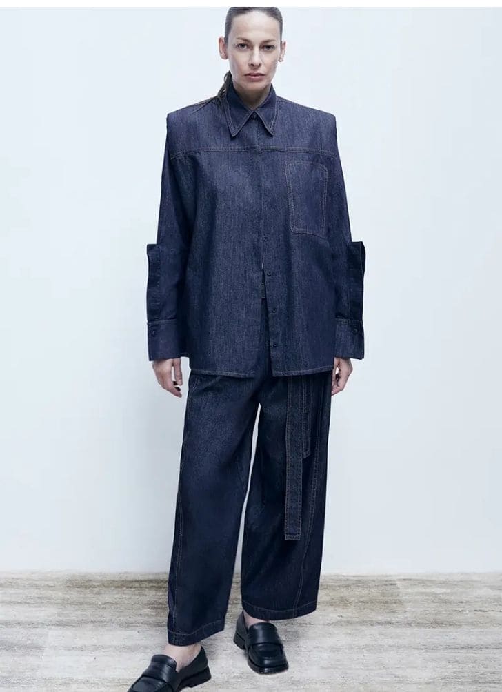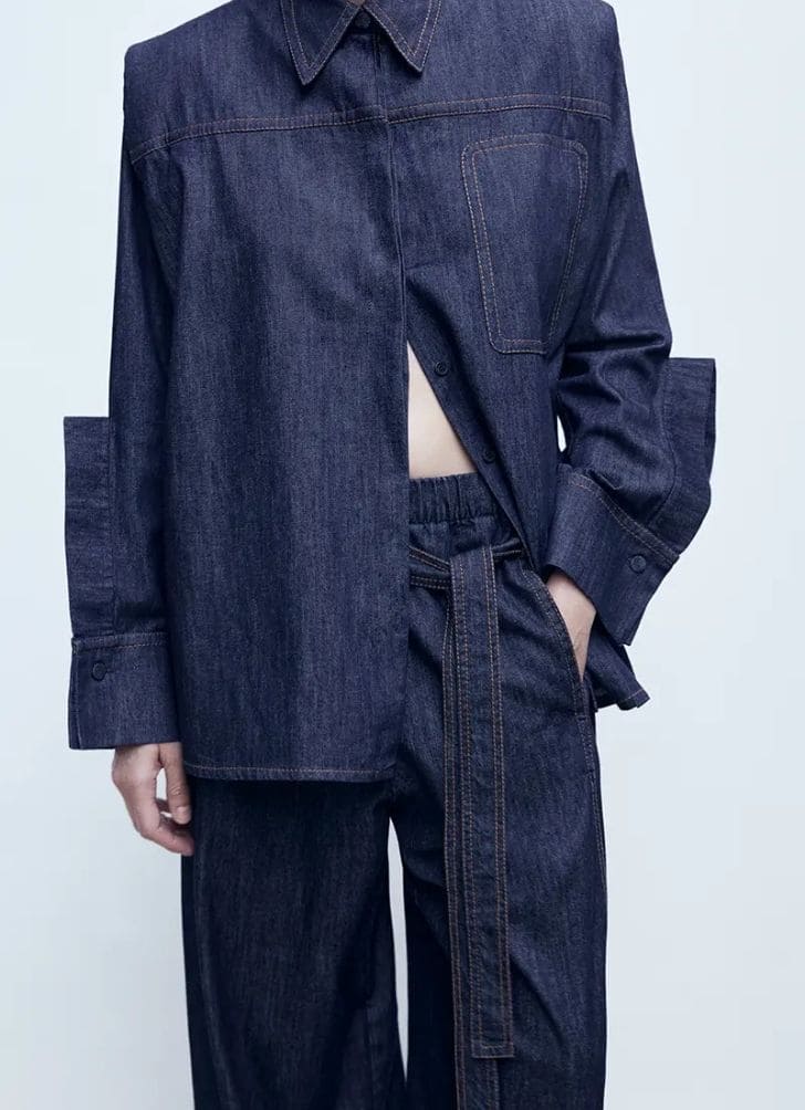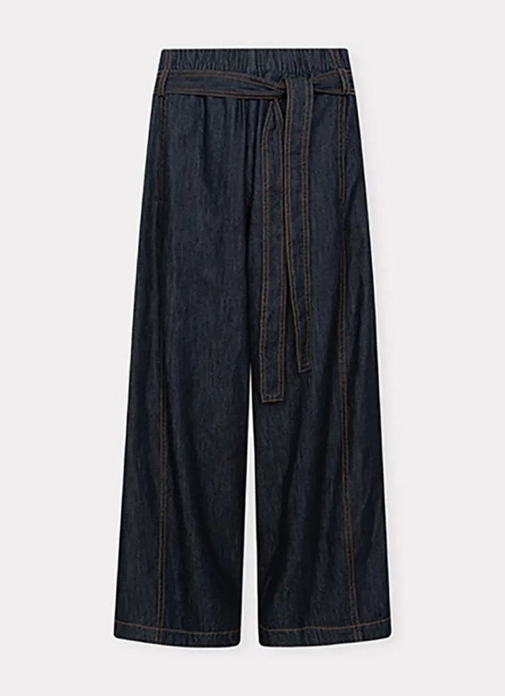 Calça jeans 100% algodão. Modelagem ampla. Cintura alta. Cós com elástico embutido. Recortes pespontados localizados na frente e nas costas. Pespontos contrastantes por toda a peça. Bolsos frontais embutidos nos recortes. Bolsos posteriores chapados. Passantes posicionados abaixo do cós. Acompanha faixa para acinturar.