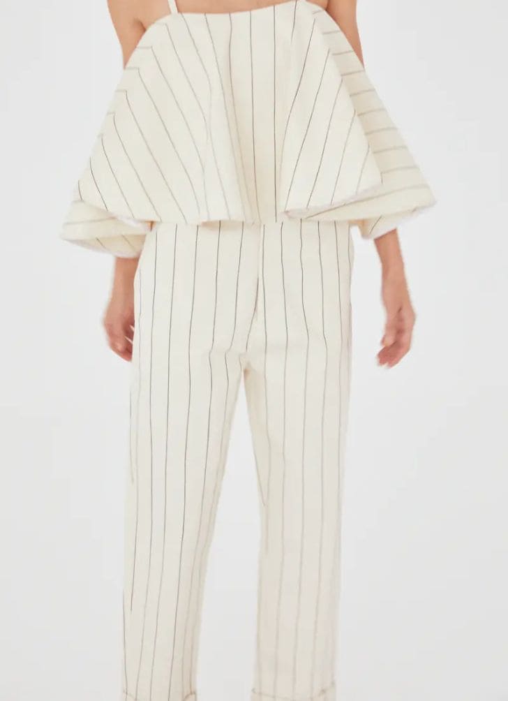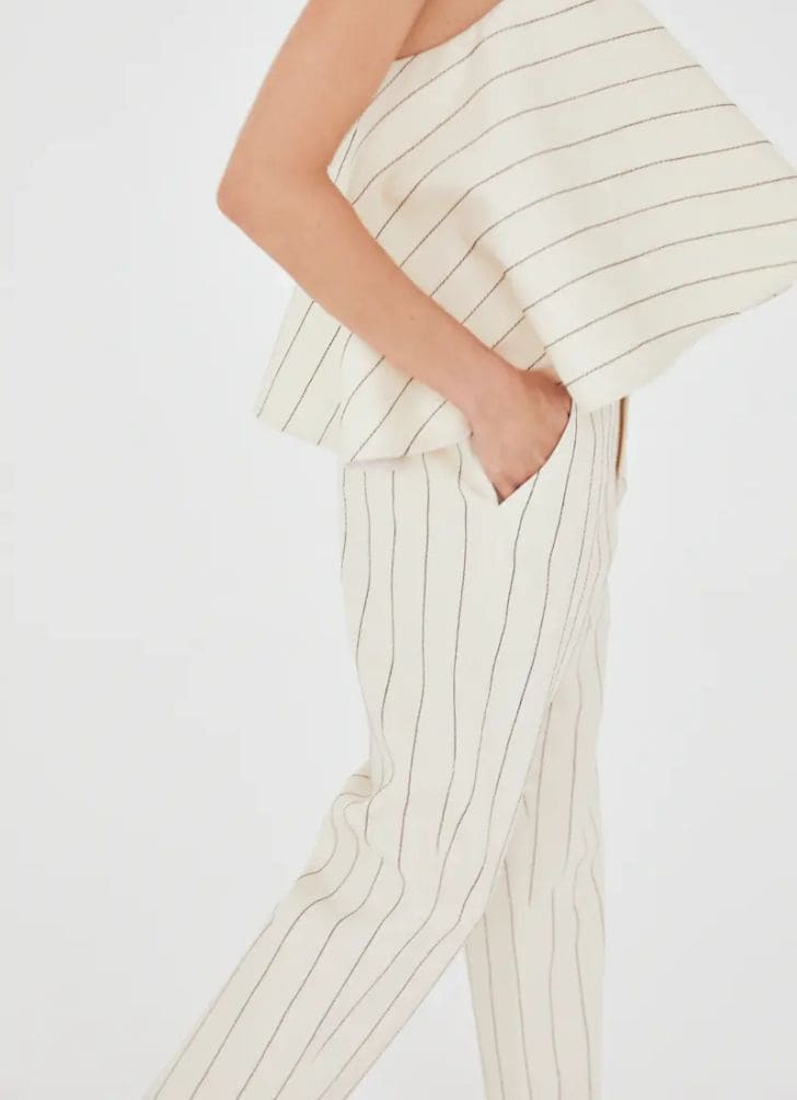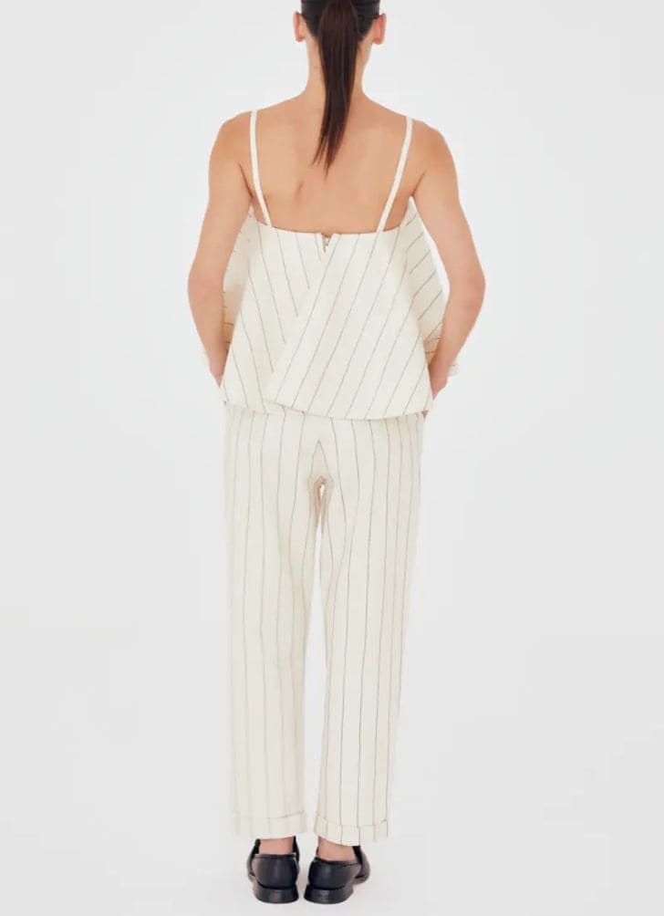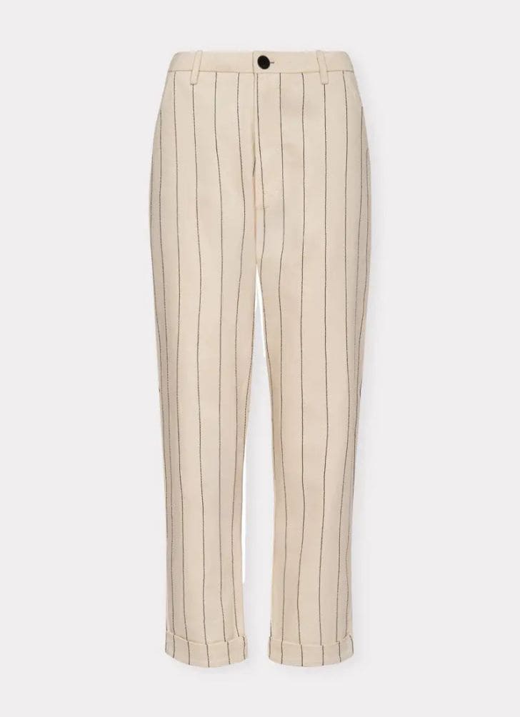 Calça de sarja com risca de giz pespontada; Tecido de sarja com bordado em risca de giz, formado por pespontos contrastantes; Cintura alta e comprimento até o tornozelo; Fechamento frontal por zíper e botão de metal; Barra dobrada; Shape abaulado; Cós sem bordado risca de giz; Detalhe no cós interno em tricoline risca de giz, com viés contrastante; Bolsos laterais diagonais e bolso posterior embutido.