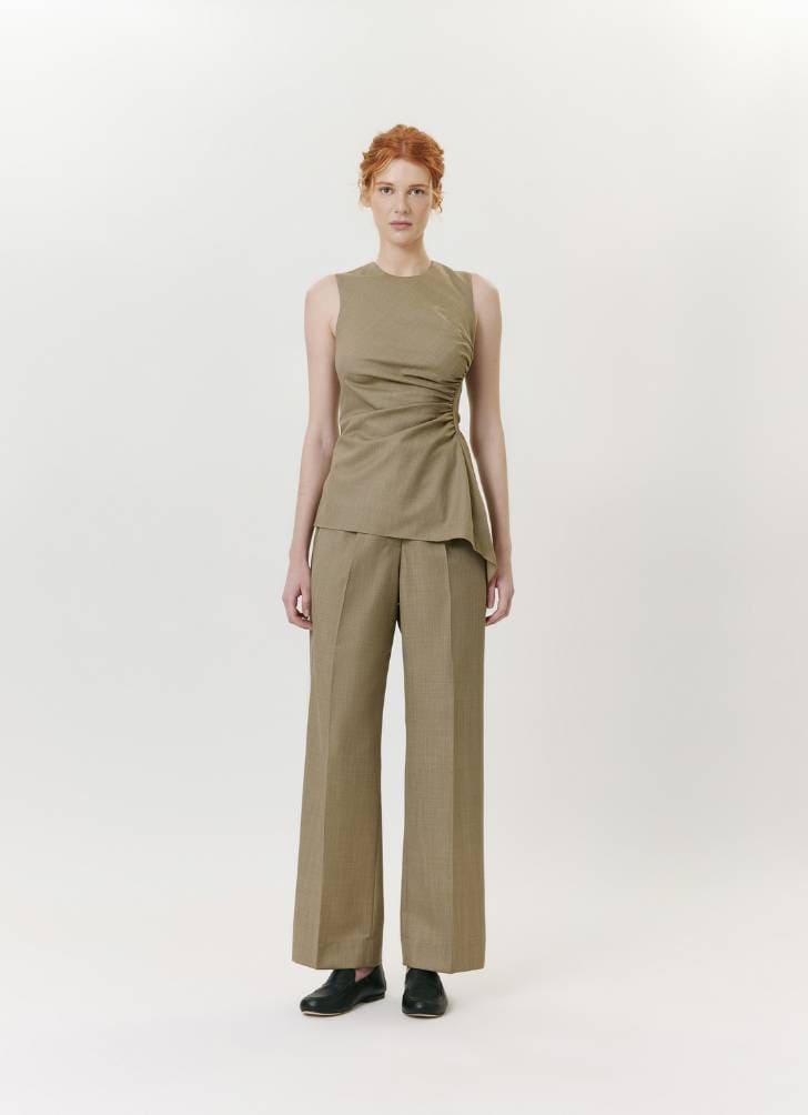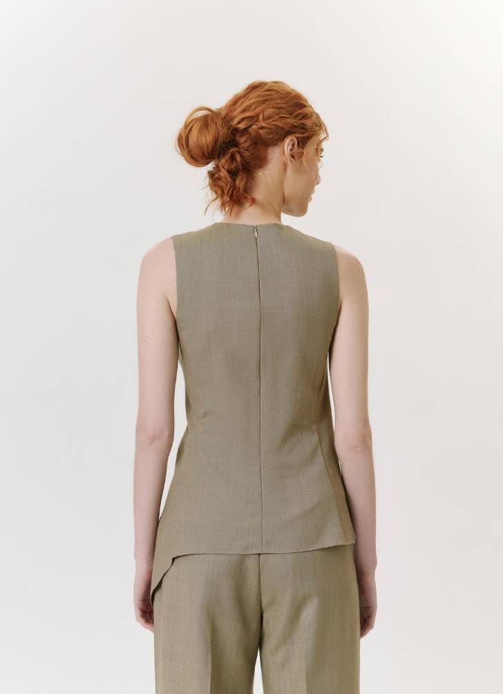 Blusa de alfaiataria em lã fria na cor Sépia. O modelo possui modelagem justa ao corpo com decote redondo e sem mangas. Destaque para o recorte vertical na lateral da peça com detalhe franzido formando uma ponta assimétrica. Fechamento por zíper invisível no centro das costas.
