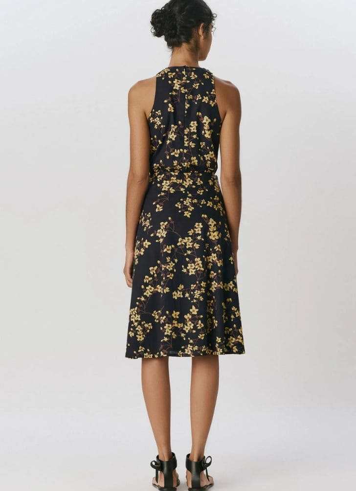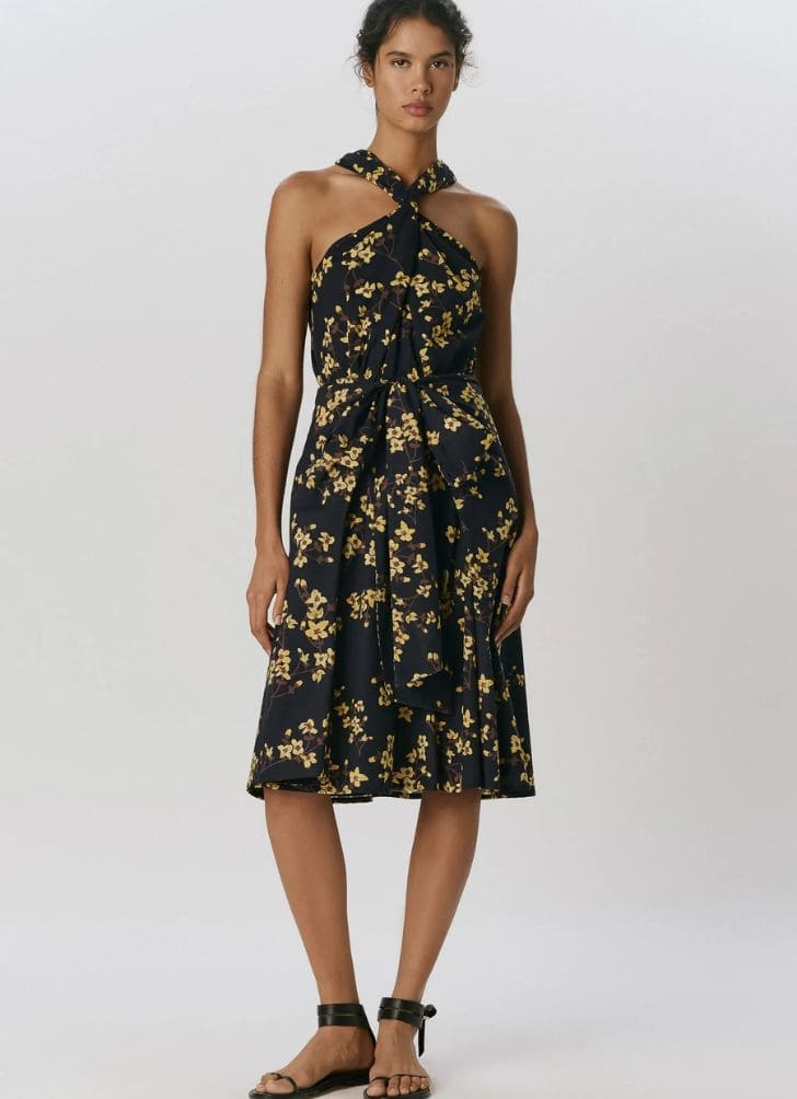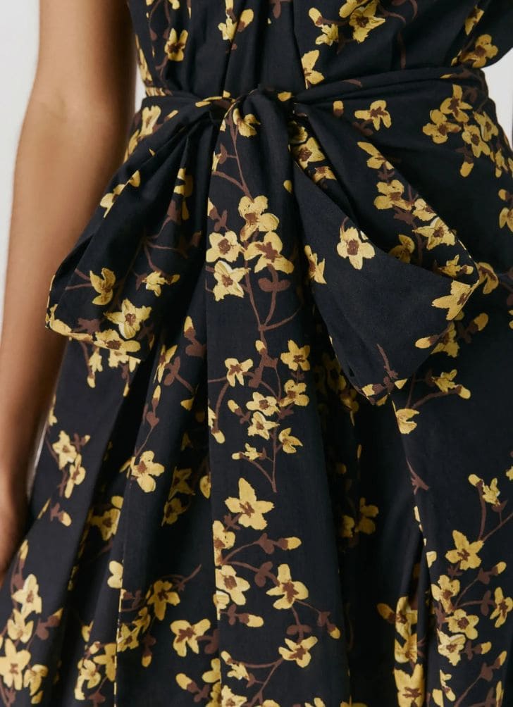 Vestido curto em voil de algodão na estampa Cerejeira. O modelo possui decote alto torcido com alças largas e recorte na cintura com franzido. A peça possui modelagem da saia curta com franzido suave e abas laterais formando uma amarração pareô. Fechamento por zíper invisível no centro das costas. O tecido utilizado não possui elasticidade.