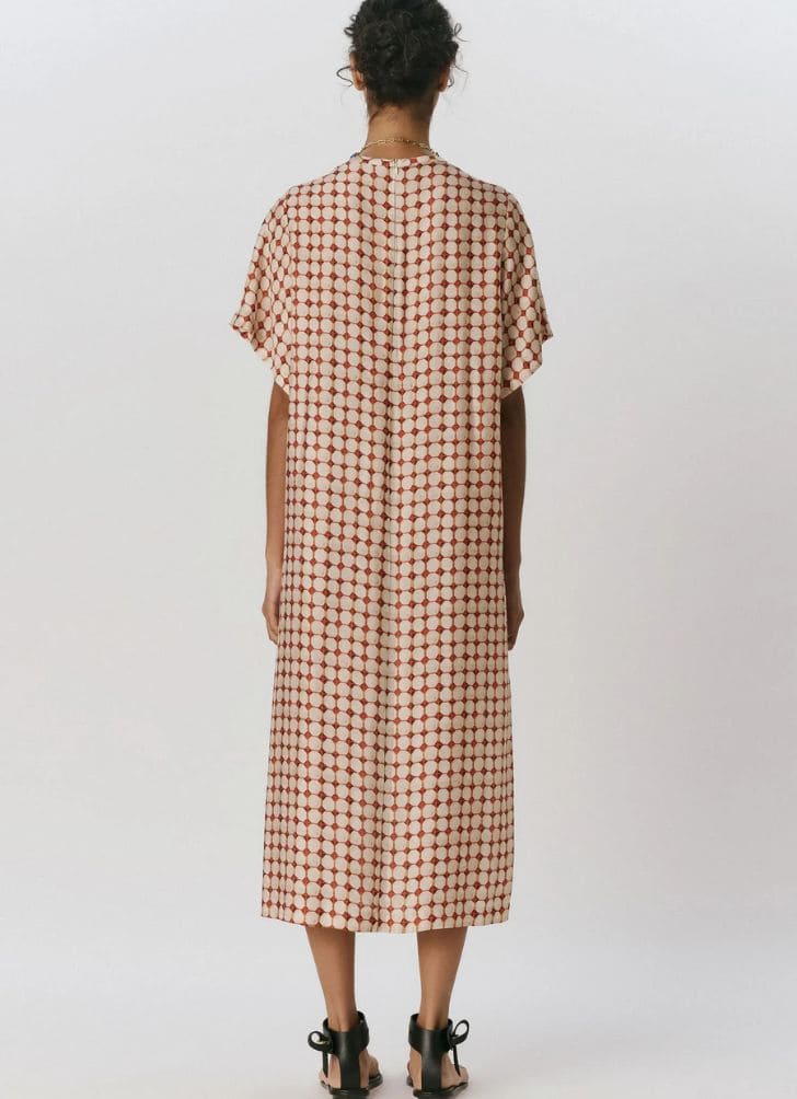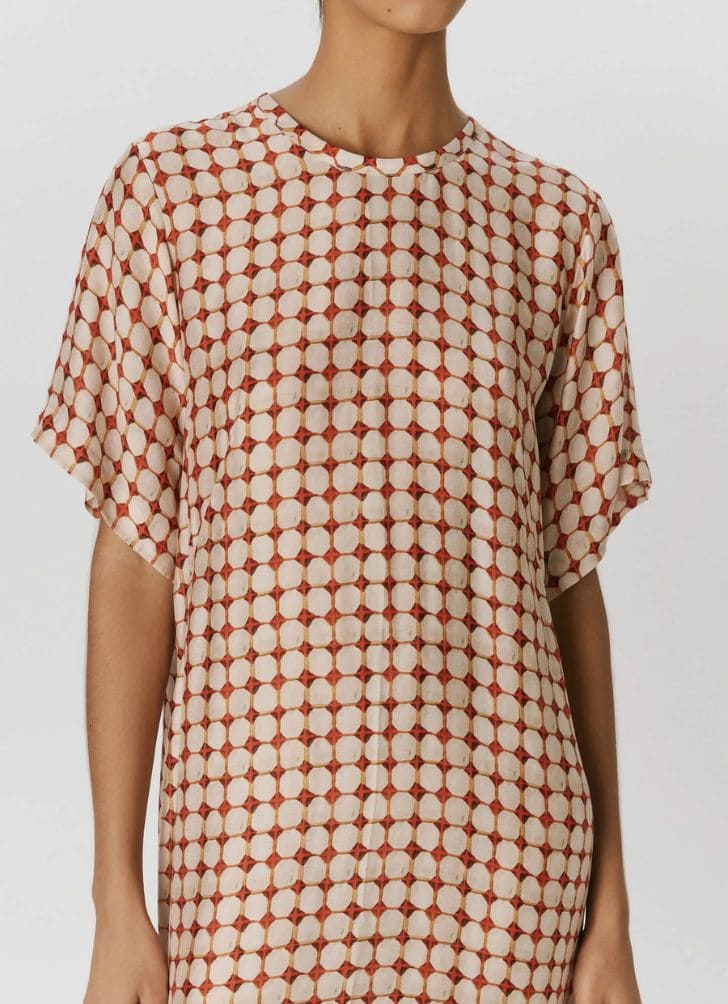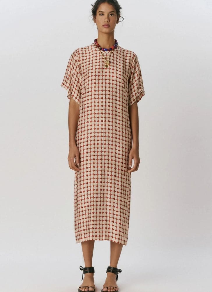 Vestido midi em viscose com seda na estampa Azulejo. O modelo possui mangas curtas, decote redondo e caimento reto. Possui detalhe de fenda na lateral. Fechamento por zíper invisível no centro das costas. O tecido utilizado possui média elasticidade.